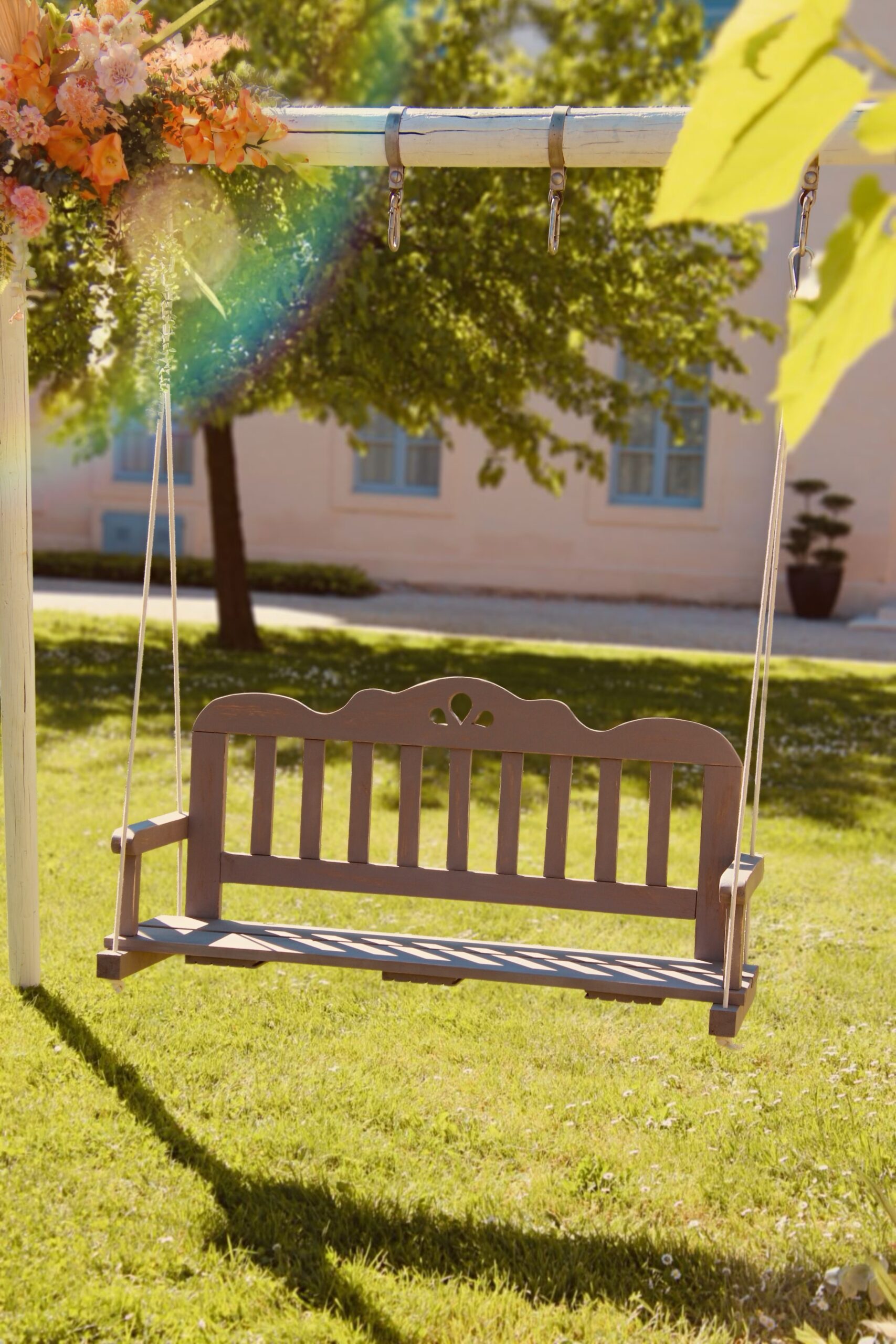 Véritable pièce maîtresse de votre décoration, cette balançoire suspendue avec banc type fauteuil, entièrement faite main, allie artisanat et élégance.
